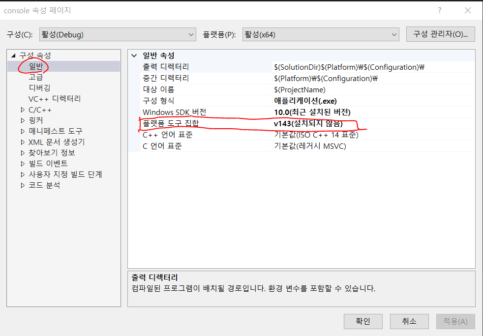 3. 플랫폼 도구 집합에서 v142로 변경하고 확인을 누른다.
