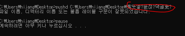 해당 배치파일을 실행시키면 다음과 같은 깨짐 현상이 일어나고 디렉토리를 찾을 수 없다.