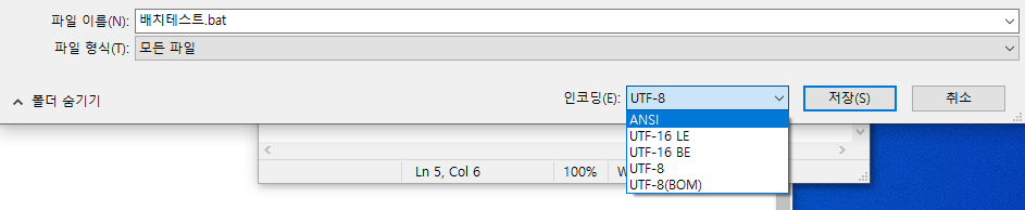 주로 메모장을 이용해 배치파일을 만들텐데, 이 경우 기본 인코딩은 'UTF-8'이다.