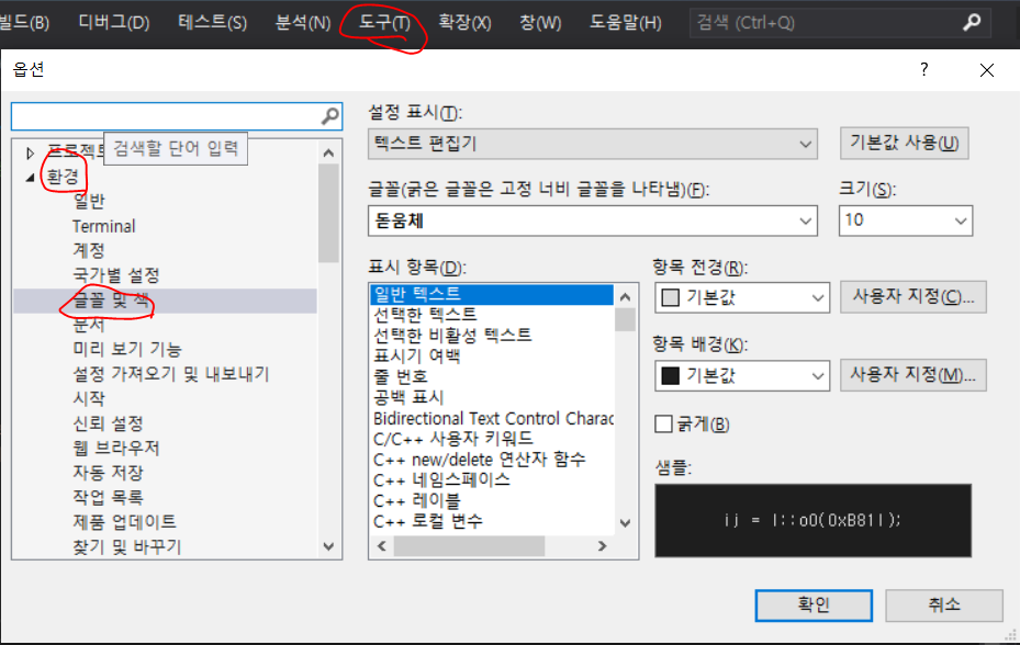 2. 옵션 창 오른쪽 탭에서 환경 > 글꼴 및 색으로 들어간다.