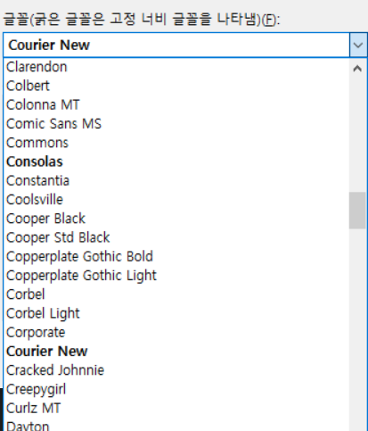 Courier New 폰트 예시 자주 사용되어서 그런지 검색해도 바로 나오고, 글꼴 목록에도 볼드체로 강조되어 있다.