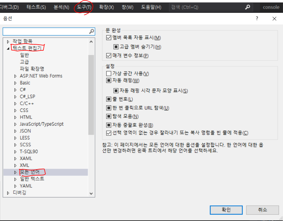 1. 도구(T) > 옵션 > 텍스트 편집기에 들어간다.